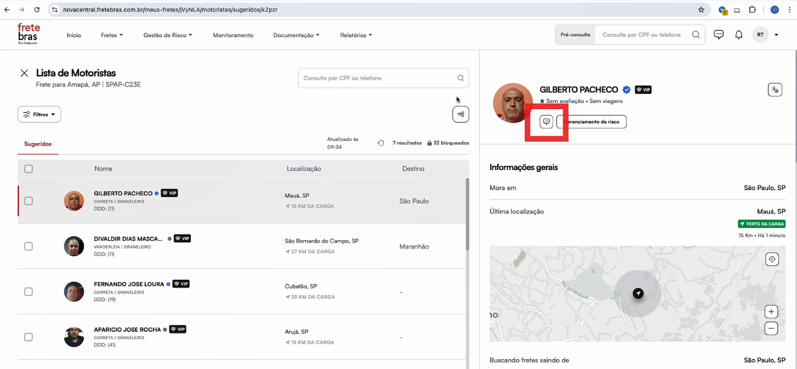 - Clique no ícone do chat, que está sempre visível, independentemente da aba que você estiver utilizando, como "Meus Fretes" ou "Motoristas Sugeridos: