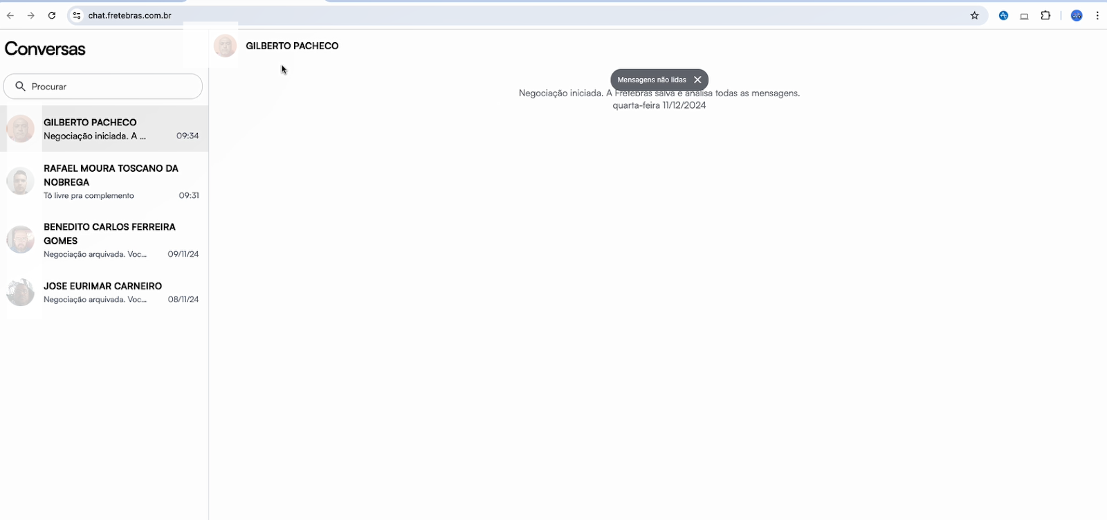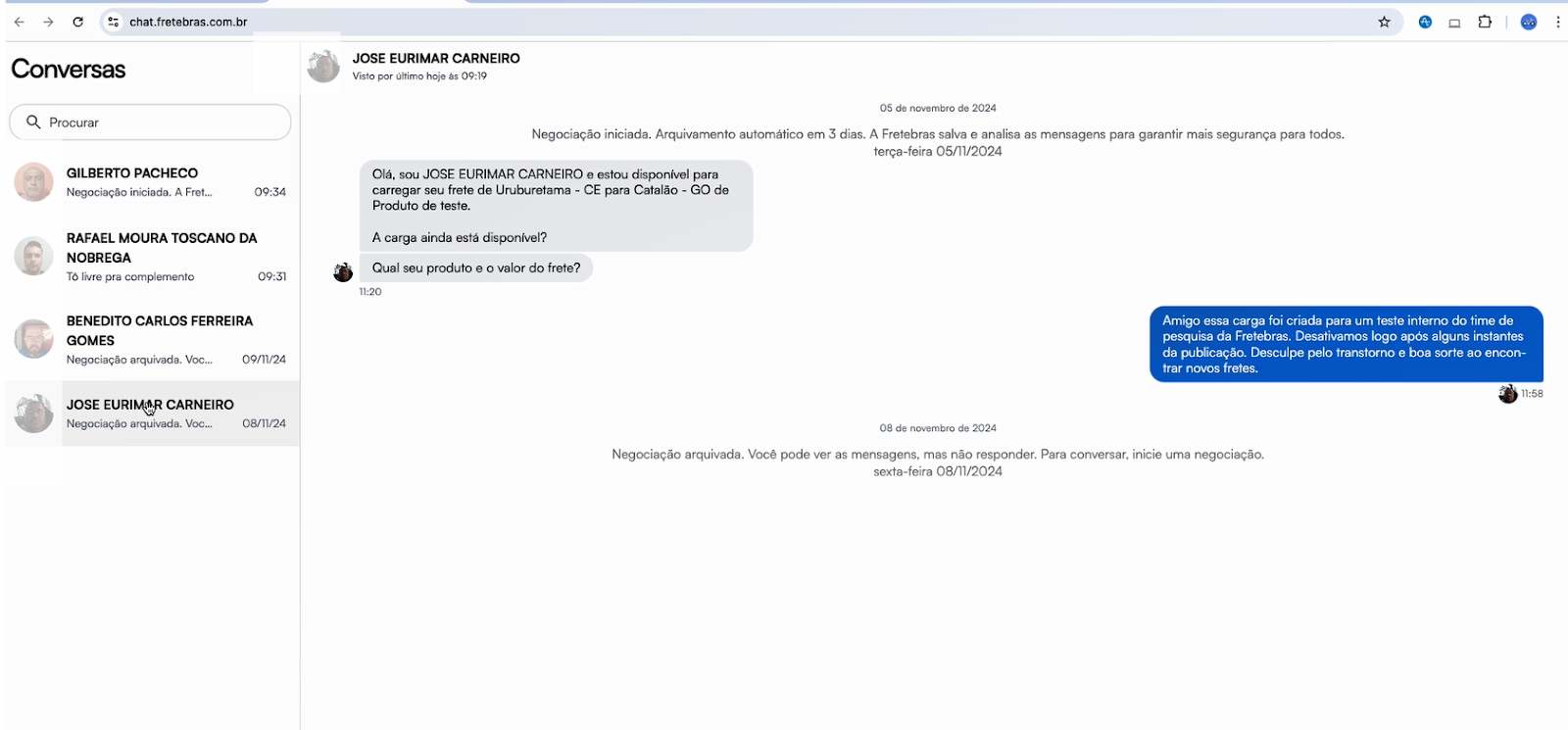 - Mensagens dos motoristas chegam diretamente no chat, indicando o nome do motorista e o frete de interesse.