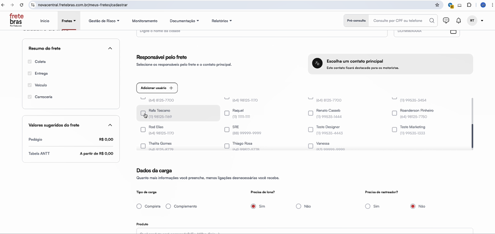 - Certifique-se de que o responsável pelo frete (ex.: operador ou gestor) esteja marcado como contato principal no cadastro do frete